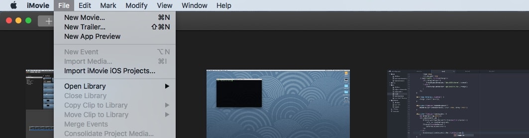 When your project has been created you should see an arrow in the center of the screen that says Import Media. The same can be accomplished by choosing File -> Import Media… from the iMovie menu.