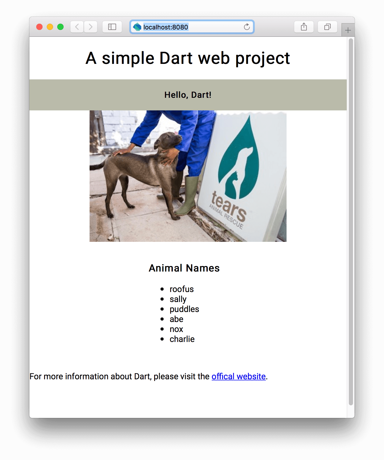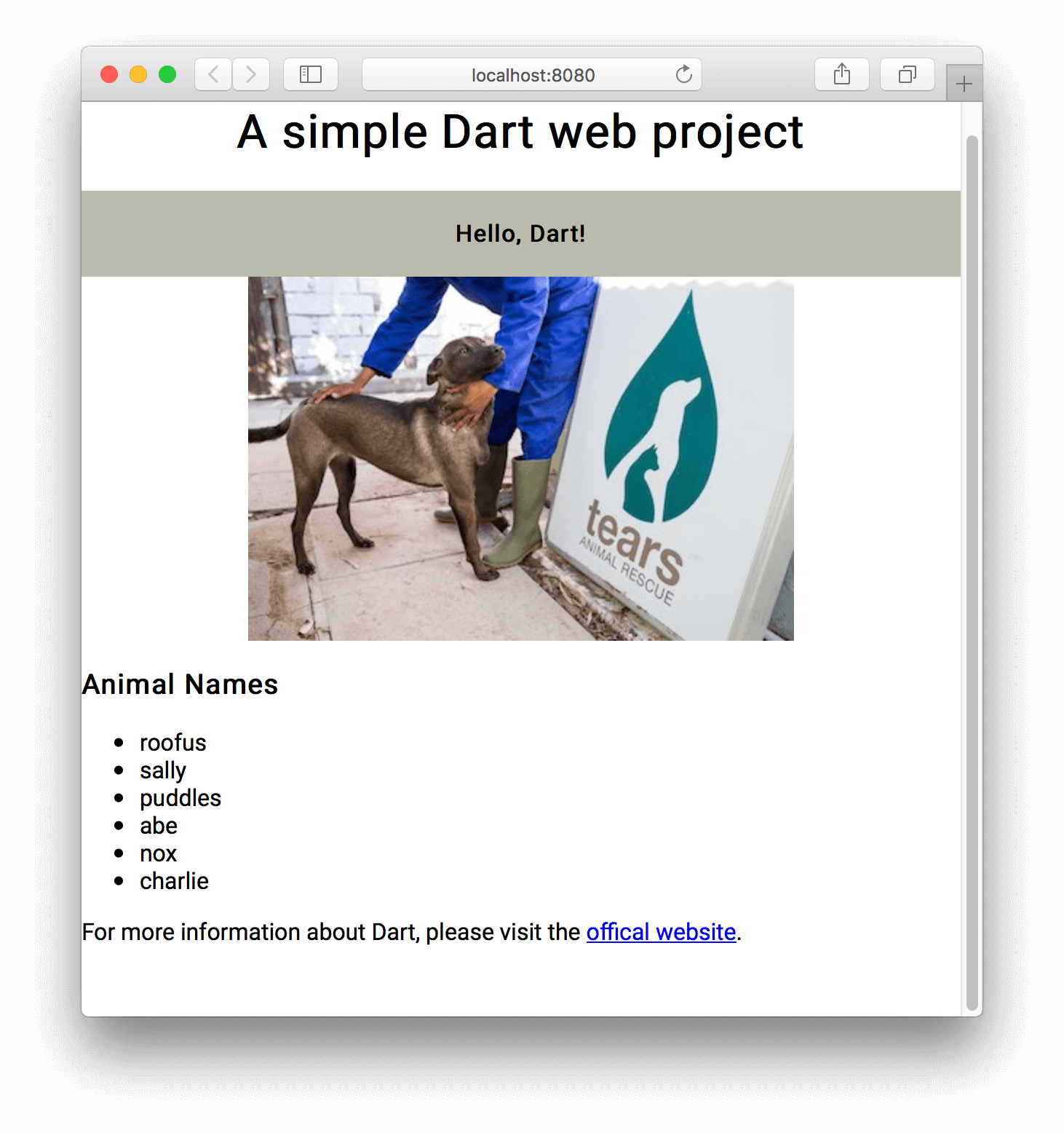 One thing you’ll quickly notice about working with Dart, is how fast changes are ready to be viewed. Let’s see this in action, by adding a bit of styling to our page.